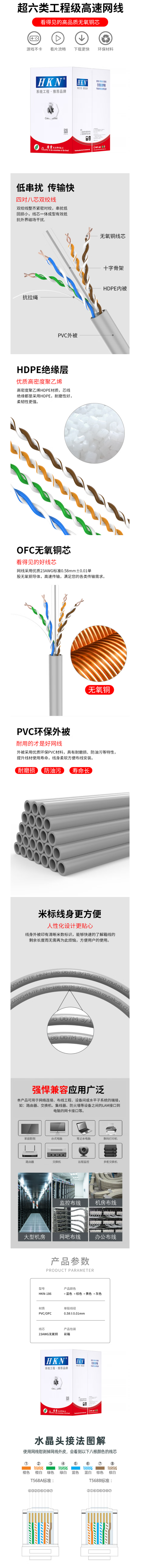 HKN 室内六类CAT6千兆无氧铜UTP电信/工程/家装/监控布线网线 305米 -186 灰色