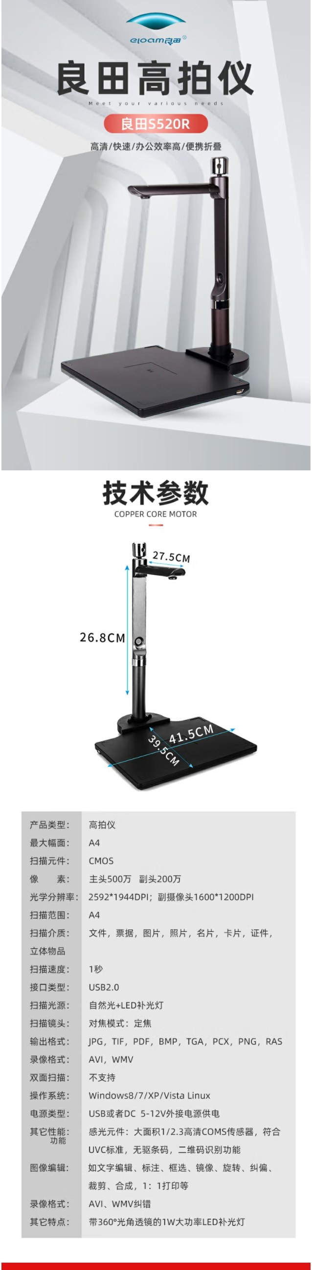良田S520R双摄像头高速高清高拍仪A4幅面带二代身份证识别仪读卡器阅读器照片文件快速扫描仪档案