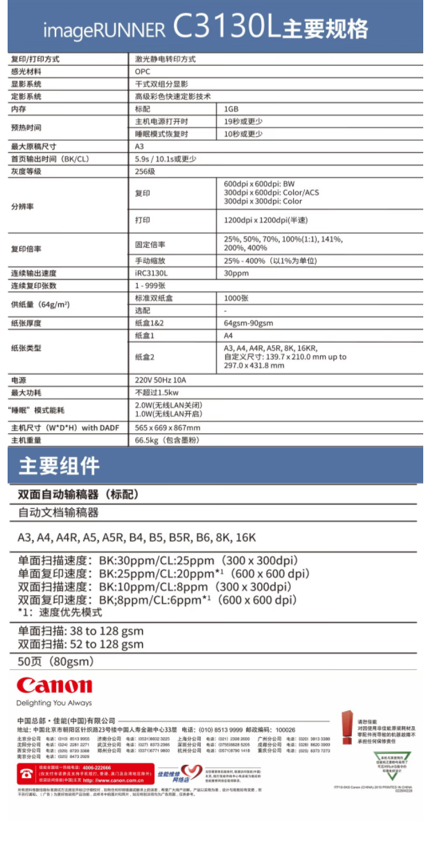 佳能(Canon)C3130L彩色激光多功能一体机打印机A3/A4数码复合机办公大型复印机(含自动双面输稿器)