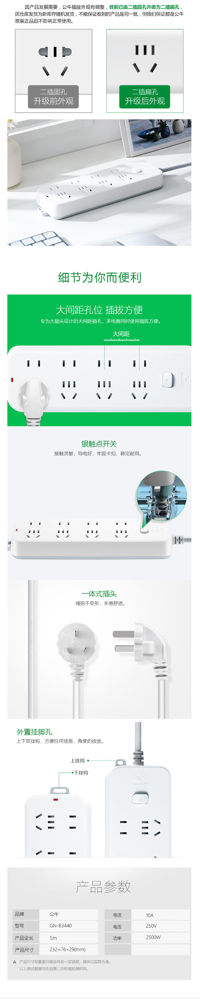公牛(BULL)插座/插线板/插排/排插/接线板/拖线 8位总控全长5米 GN-B3440