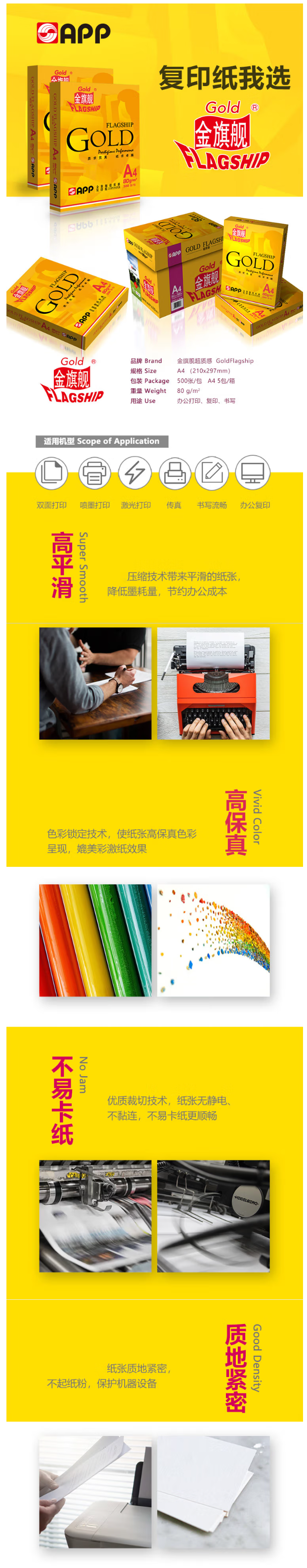 金旗舰超质感复印纸80克A4 打印纸复印纸黄箱10包装整箱500张一包 80克A4/10包/箱