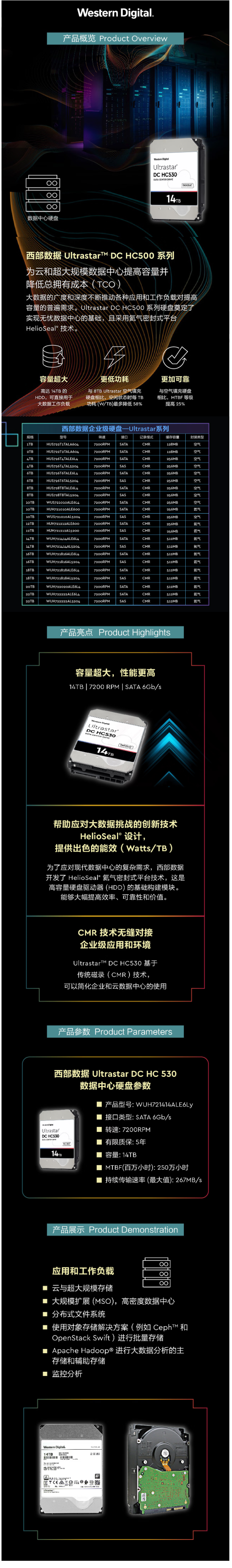 西部数据 企业级氦气硬盘 Ultrastar HC530 SATA 14TB 7200转 512MB CMR (WUH721414ALE6L4)