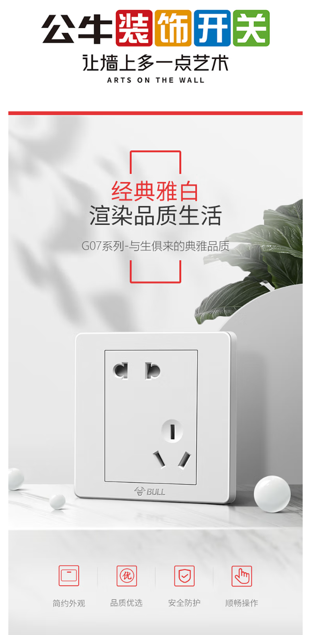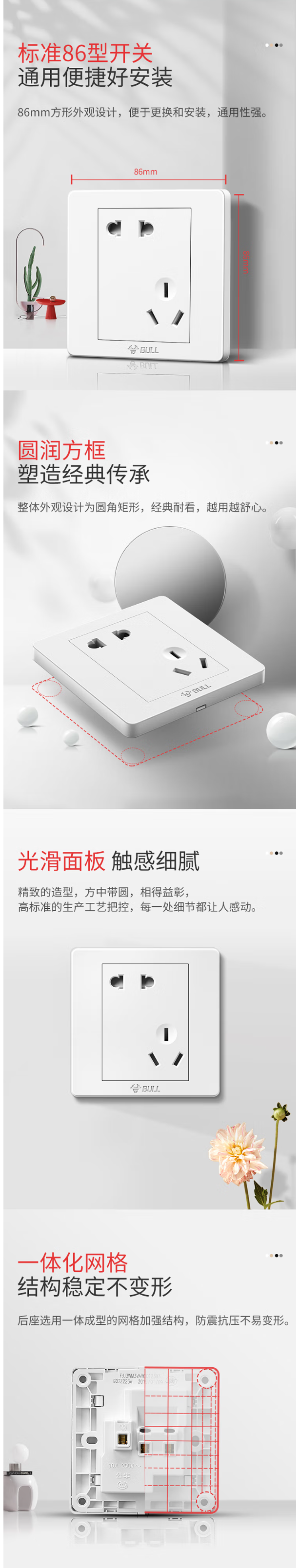 公牛(BULL) 墙壁插座 G07系列 斜五孔开关 86型插座面板G07Z223A 白色 10只装 暗装插座