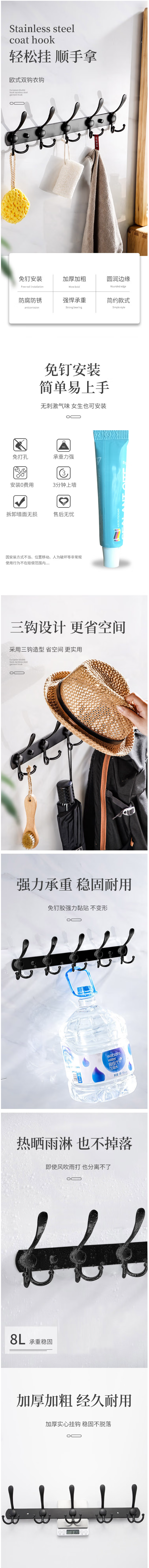 梦庭 挂钩 壁挂墙上不锈钢粘钩 免打孔衣服挂钩 欧式挂钩黑色 15钩