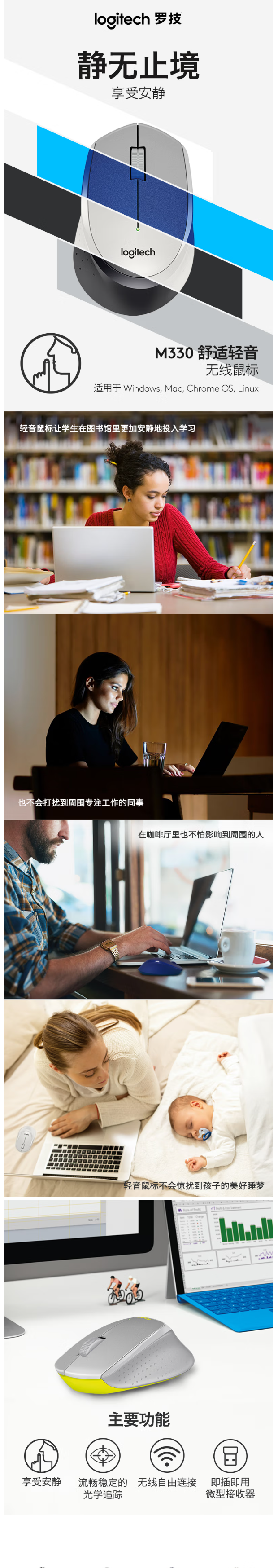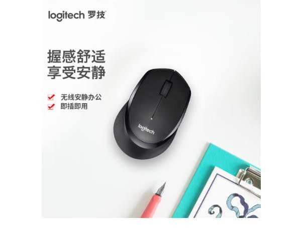 罗技(Logitech)M330 静音鼠标 无线鼠标 办公鼠标 右手鼠标 带无线微型接收器 黑色