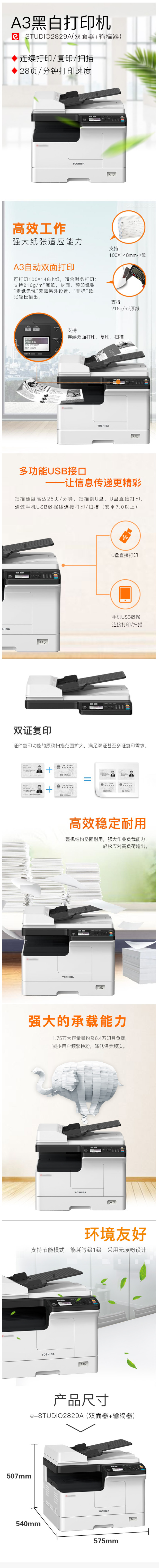 东芝(TOSHIBA)DP-2829A 数码复合机 A3黑白激光双面打印复印扫描 主机+双面器+自动输稿器+单纸盒