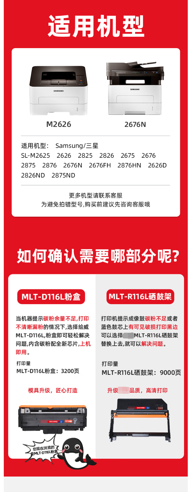 靓格MLT-D116S易加粉粉盒 适用三星SL-M2676N M2626D M2826ND M2625D M2825DW M2875打印机一体机