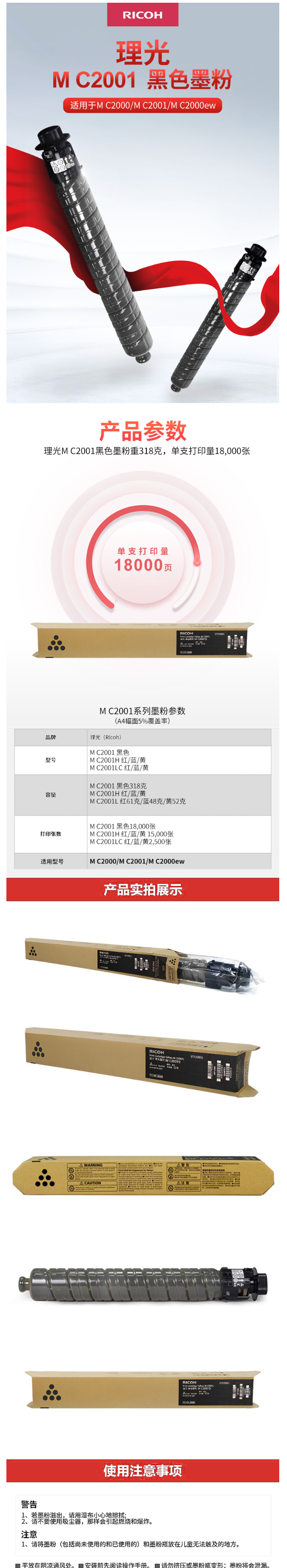理光(Ricoh)MC2001型原装粉盒用于MC2001/MC2000ew/MC2000彩色复印机 2001L高荣 原装墨粉 黑色墨粉盒(约18000张)