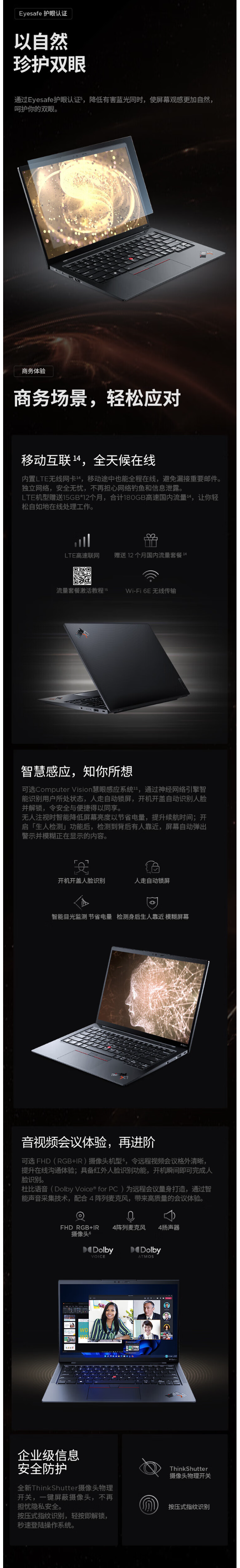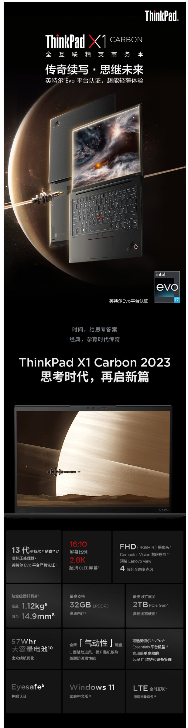 ThinkPad X1 Carbon 2023 可选Evo认证 14英寸高端超轻薄本 商用办公本 ibm笔记本电脑 i5-1135G7 16G内存 512G固态 高色域 指纹识别 背光键盘
