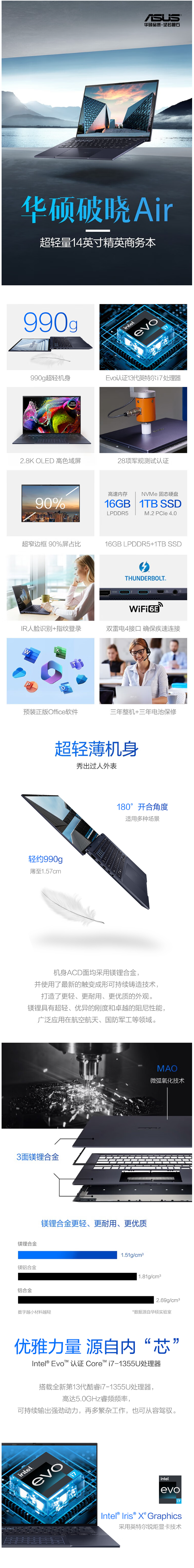 华硕破晓Air 13代酷睿14英寸轻薄商务笔记本电脑手提办公学习 i7-1355U 16G 1TB SSD 2.8K OLED屏