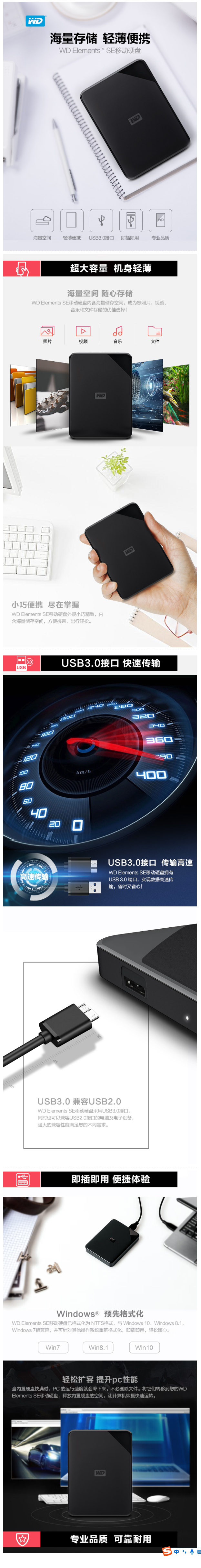 西部数据(WD) 2TB 移动硬盘 USB3.0 Elements SE 新元素系列2.5英寸 机械硬盘 外置存储 手机笔记本电脑外接