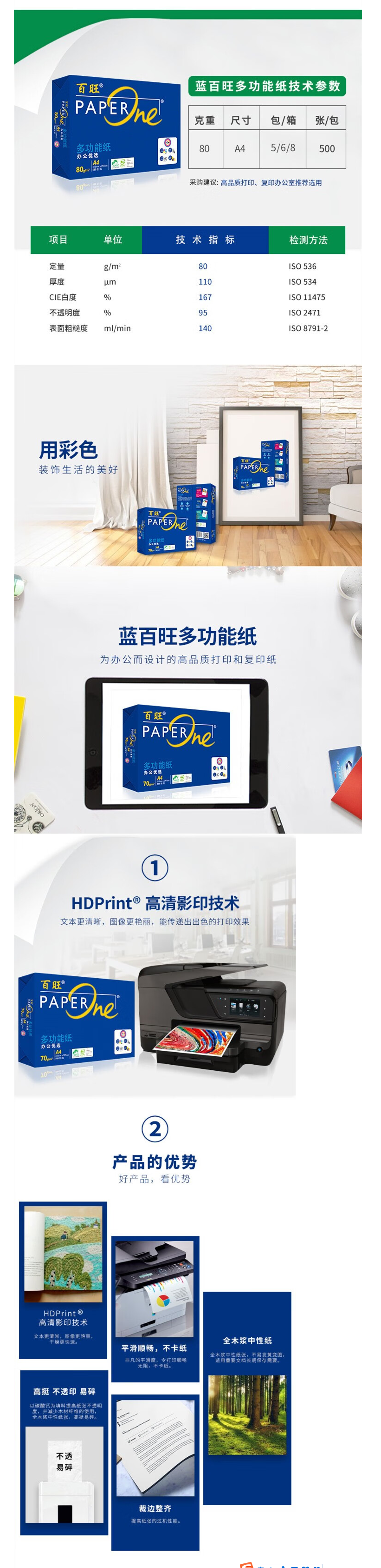百旺蓝百旺80g A3复印纸多功能办公用纸打印纸 高清影印 500张/包 5包/箱