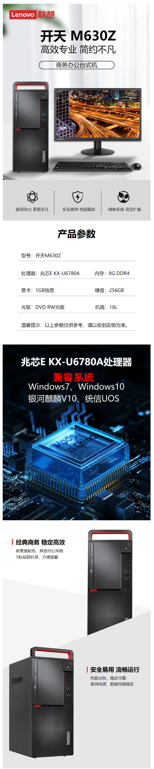 联想开天M630Z商用台式机电脑 兆芯KX-U6780A 支持win7 win10 主机+23.8英寸显示器 16G内存 512G固态 2G独显 麒麟系统 已激活