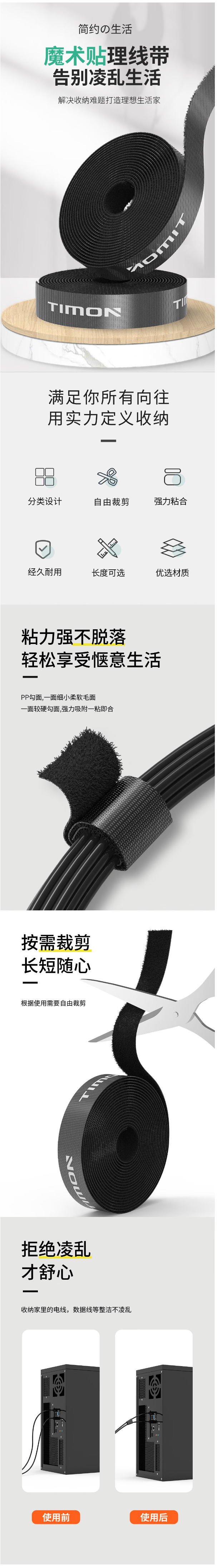 泰盟(TIMON)魔术贴扎带 电脑理线带桌面线缆固定收纳理线器电源线扎线带捆线带 黑色30米