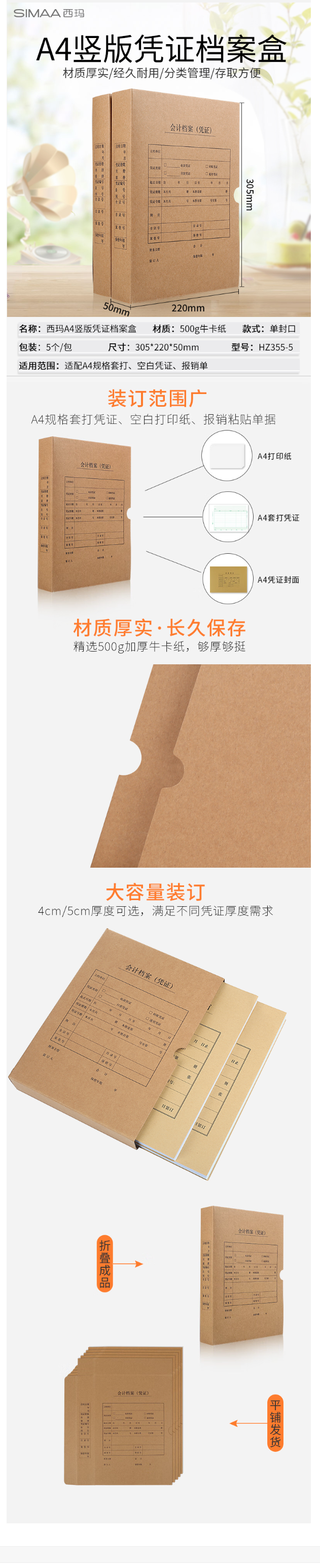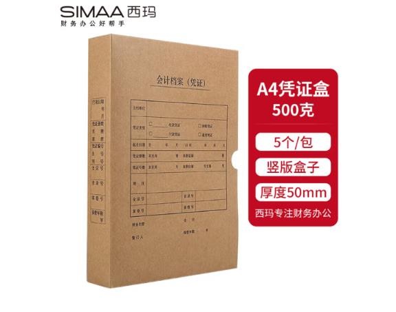 西玛(SIMAA)A4凭证档案盒 单封口500g牛卡纸305*220*50mm 5个/包 a4记账凭证纸会计装订盒HZ355-5